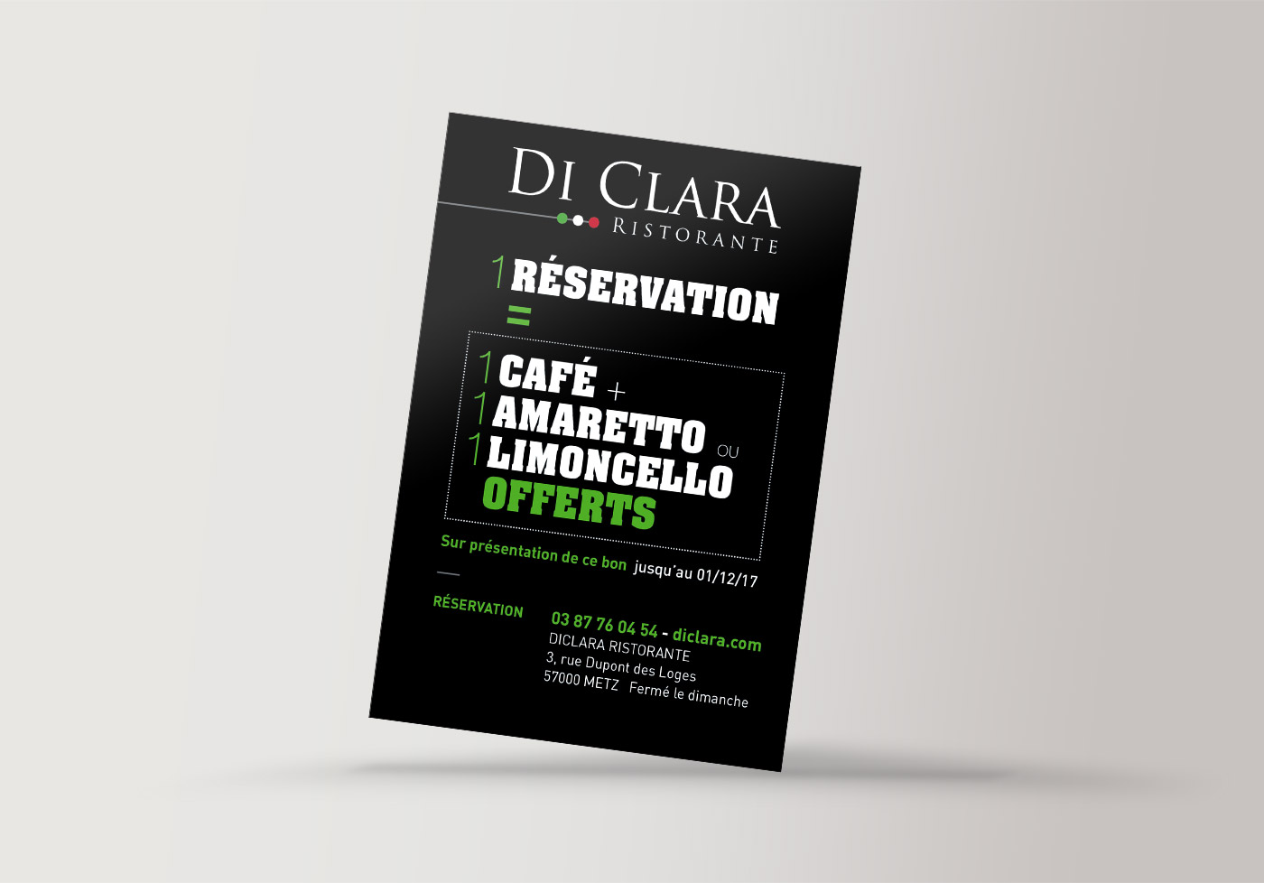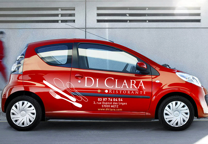 Pour développer la notoriété du restaurant, Diclara à Metz à souhaité un marquage adhésif pour sa voiture de société. Cette communication mobile permet de diffuser de façon permanente et à faible coût les coordonnées et développe la notoriété du restaurant dans un réseau de proxité dans la ville de Metz.